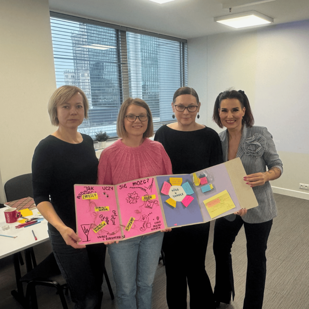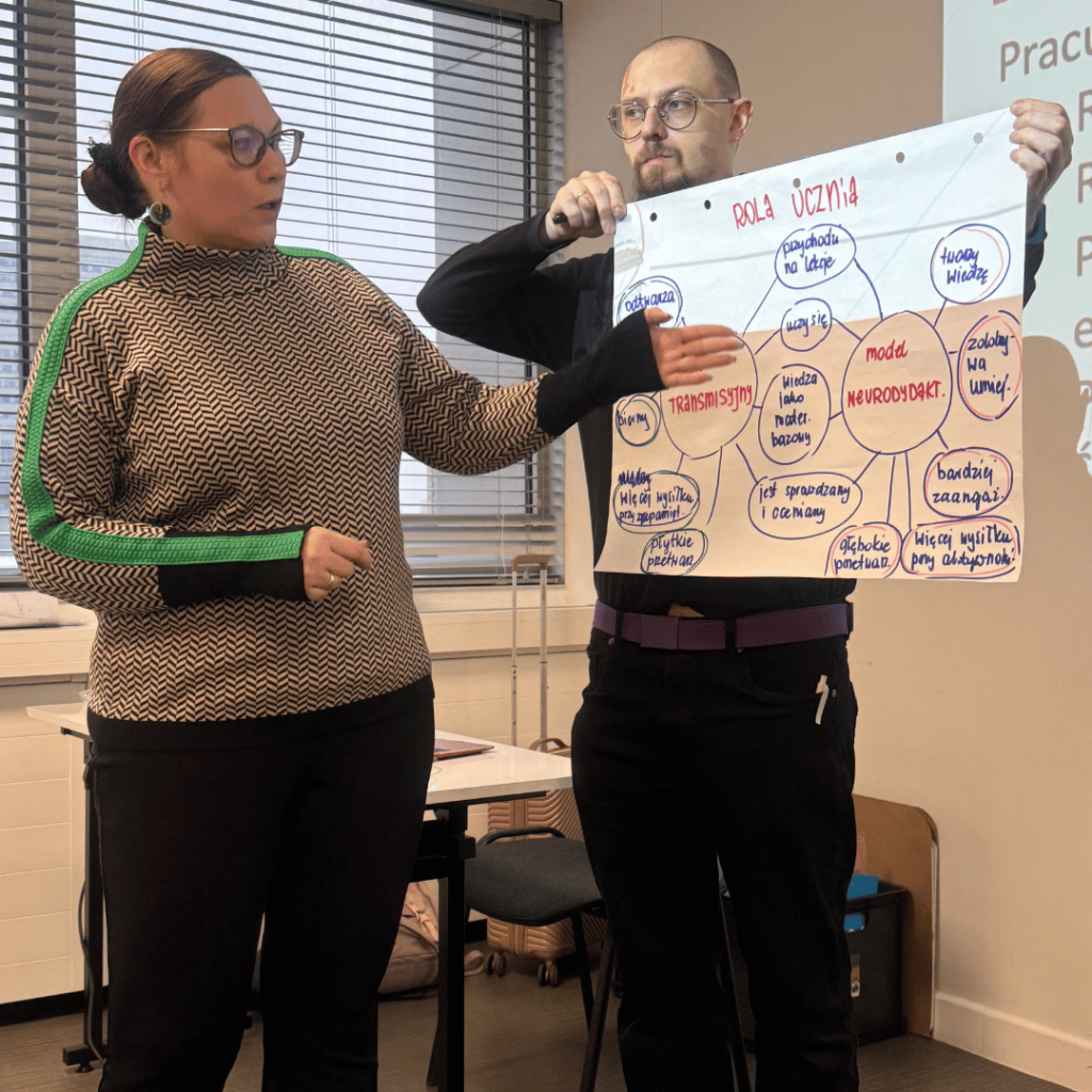 Szkolenie obejmowało zarówno teorię, jak i praktykę. Odbyliśmy metaforyczną podróż do wnętrza mózgu, zgłębiając tajniki zapamiętywania i analizując czynniki, które mają na nie wpływ. Przyjrzeliśmy się bliżej temu, co dzieje się w „mózgach w klasie” – zarówno w kontekście uczniów, jak i nauczycieli. Omówiliśmy również aspekty nastawienia, jego znaczenie w procesie edukacyjnym oraz sposoby jego kształtowania.